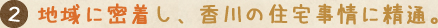- 私たちは、香川県高松市を中心に長年、地域に根ざした業務を行っており、香川の住宅事情等を熟知しております。また、広告等に頼らずにほとんどの受注をクチコミで行ってまいりました。これからも地域の皆様に愛されうる工務店を目指し日々精進いたします。